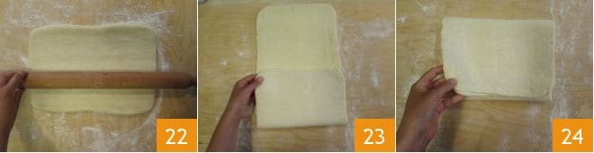 Luego recupera el bloque, colócalo siempre en la superficie enharinada; extiéndelo en dirección de los pliegues 22 hasta obtener un rectángulo del mismo tamaño que antes. En este punto, repite el pliegue a 3 llevando siempre un borde de masa hacia 1/3 del rectángulo y el otro a cubrir (23-24). Envuelve en film transparente y coloca en el frigorífico otros 30 minutos y haz un último pliegue a 3 como acabo de describir. Envuelve de nuevo en film transparente y deja reposar nuevamente en el frigorífico, esta vez durante unos 120 minutos.