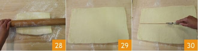 Cuando el hojaldre haya reposado, transfiérelo a una superficie enharinada y utilizando un rodillo 28, extiéndelo hasta obtener un rectángulo de 30x60 cm, de un espesor de aproximadamente 3 mm 29. Luego córtalo por la mitad en el sentido de la longitud de tu rectángulo 30, para obtener 2 de 15x60 cm.