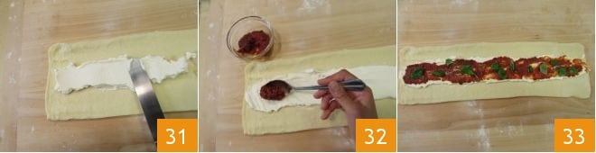 Unta la mitad de la ricotta solo en la tira central de los dos rectángulos 31, esparce encima la mitad del paté de tomates secos 32 y añade algunas hojas de albahaca 33.