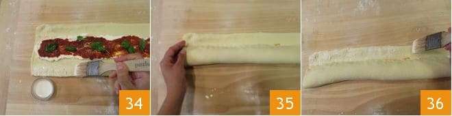 Pinta el borde de la masa sin relleno con la leche 34 y dóblalo para cubrir el relleno 35. Luego pinta también el otro lado 36