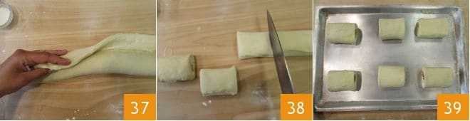 y llévalo hacia ti, haciéndolo adherir a la masa inferior 37, para obtener un rollo. Corta los extremos irregulares 38 y saca cilindros de aproximadamente 7 cm de largo 38. Colócalos en una bandeja de horno, con el cierre apoyado en la base 39.