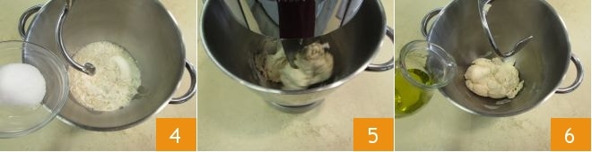 y el azúcar 4. Activa la batidora hasta obtener una masa homogénea 5. Luego añade el aceite 6 y deja que se incorpore hasta que la masa esté bien ligada al gancho.