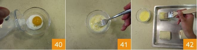 En un cuenco, vierte la yema y la leche 40; bate con un tenedor 41 y úsalo para cubrir la superficie de los sacotillos 42.