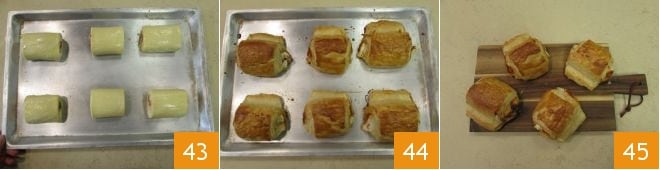 Deja fermentar durante una hora a temperatura ambiente, lejos de corrientes de aire 43. Luego hornea en horno estático precalentado a 200° durante 30 minutos, en la bandeja central. Luego saca del horno 44 y sirve tus sacotillos salados bien calientes 45.
