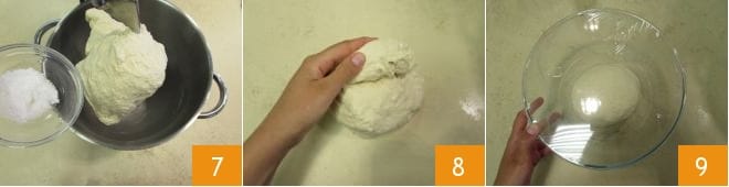 Por último añade la sal 7 y trabaja durante unos minutos más hasta que esté completamente absorbida. Luego, transfierelo a una superficie de trabajo 8 y dale a la masa una forma esférica. Transfiere a un bol, cubre con film transparente 9 y deja que fermente a temperatura ambiente durante 2 horas.
