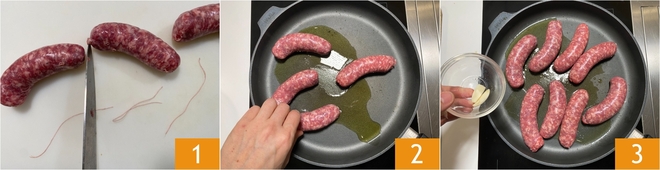 Para preparar la salchicha en sartén, lo primero es quitar el hilo que las une 1 y dejar la tripa, así mantendrán la forma. Calienta un chorrito de aceite en una sartén amplia antiadherente y, a continuación, coloca las salchichas 2 y añade los dientes de ajo 3.