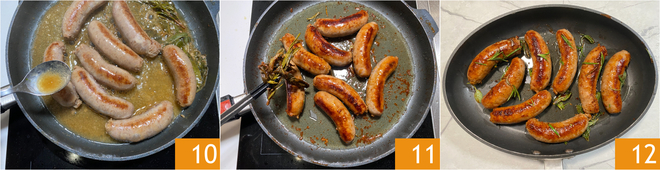 Durante la cocción, remueve de vez en cuando para conseguir un color homogéneo 10. Una vez listas, retira las hierbas aromáticas 11. Sirve inmediatamente la salchicha en sartén decorando con alguna ramita de romero y alguna hoja de salvia 12.