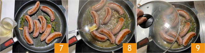 Aromatízalas con romero 4, salvia y laurel 5. Dora las salchichas a fuego medio-alto hasta que estén doradas y luego dales la vuelta 6; tardarán unos 6 minutos en total.