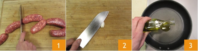 Para preparar la salchicha en sartén comienza dividiendo las salchichas una por una si estuvieran atadas con cuerda 1. Aplasta un diente de ajo limpio con el dorso de un cuchillo 2 y muévete a los fogones. En una sartén vierte un poco de aceite 3,