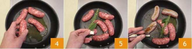 coloca las salchichas 4 y añade también el ajo junto con la ramita de romero y la hoja de laurel 5. Deja chisporrotear a fuego vivo durante unos 10 minutos mezclando tan pronto como los varios lados estén un poco dorados 6.