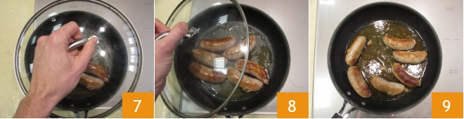 Retira los aromas, baja el fuego y cubre con la tapa 7 luego deja cocinar unos diez minutos más agitando de vez en cuando la sartén 8. Aquí tienes tu salchicha en sartén lista para disfrutar muy caliente, adorna con las hierbas aromáticas frescas y buen provecho 9.