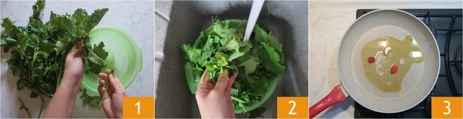 Para preparar salchicha y grelos, comenzad limpiando estos últimos: guardad los tallos con las hojas más pequeñas y las inflorescencias, aseguraos de que no haya partes amarillentas en las hojas más grandes, esas se eliminan. Deslizad de los tallos las hojas sanas manteniendo con una mano el tallo y tirando hacia arriba la parte con las hojas 1. Lavad bien los grelos bajo agua corriente 2. En una sartén poned aceite, ajo y la guindilla partida por la mitad 3,