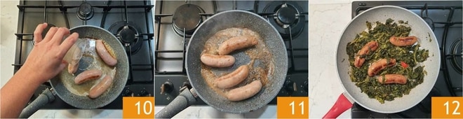 y verted el vino blanco 10. Haced evaporar y secar el vino, luego completad la cocción de las salchichas en la sartén hasta que estén doradas: si queréis podéis añadir un poco de aceite 11. Una vez que las salchichas estén bien doradas, trasladadlas a la sartén con los grelos. Volved a poner la sartén al fuego y dejad que se impregne el sabor durante cinco minutos. Servid salchicha y grelos disfrutando de todo bien caliente 12.