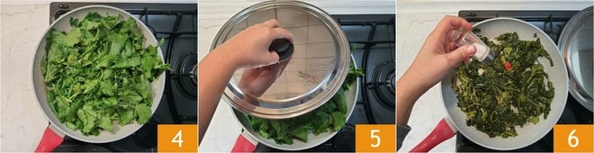 calentad todo y poned también los grelos dentro 4. Cubrid con una tapa y coced los grelos hasta que estén bien marchitos 5. Revolved a menudo con una cuchara de madera y añadid sal a mitad de la cocción. Retiradlos del fuego cuando estén bien suaves y marchitos 6.