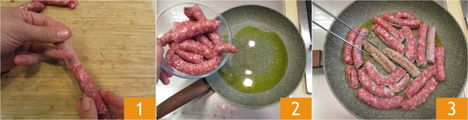Para preparar salchicha y patatas a la cerveza, quitad la tripa de la salchicha 1 y cortadla en trozos de 4 cm. Dorad la salchicha en una sartén a fuego medio con 20 g de aceite 2. Doradla por todos los lados 3.