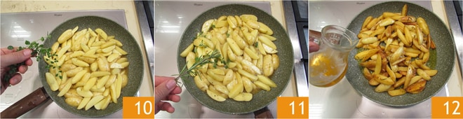 Sazonad con orégano 10 y romero 11 y otros 20 g de aceite. Cuando las patatas tengan ese bonito color dorado, añadid la cerveza restante 12 y dejad que se reduzca.