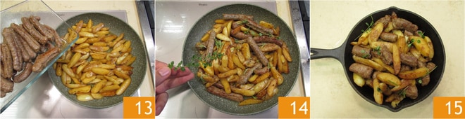 Agregad la salchicha a la sartén 13 y continuad la cocción durante otros 5 minutos. Con el fuego apagado, añadid más romero y orégano 14. Servid inmediatamente la salchicha y patatas a la cerveza 15.