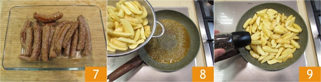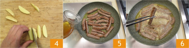 Pelad y cortad las patatas en gajos. Una vez dorada, después de 10 minutos, rociad la salchicha con 200 g de cerveza 5 y subid el fuego. Continuad la cocción por otros 5 minutos en la sartén y, en cuanto se haya reducido la cerveza, retirad la salchicha de la sartén 6.