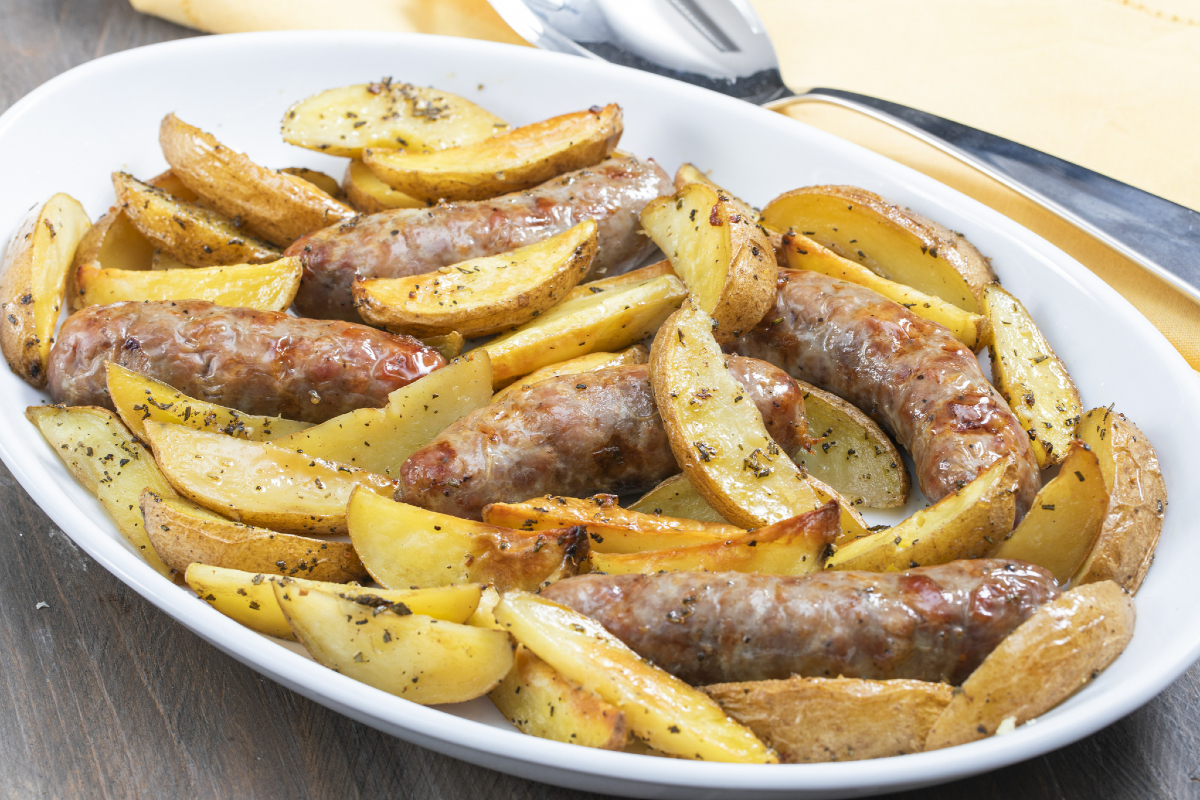 Si buscáis un segundo plato sabroso para una cena en familia o una noche informal entre amigos, con salchichas y patatas al horno estaréis seguros de acertar. Una receta rústica, fácil y rápida de preparar, que satisface el paladar con su combinación perfecta de ricos sabores. Os mostramos cómo obtener una cocción al horno perfecta cocinando primero las patatas, de manera que la salchicha quede jugosa y no seca; ¡todo estará bien dorado con una agradable costra!