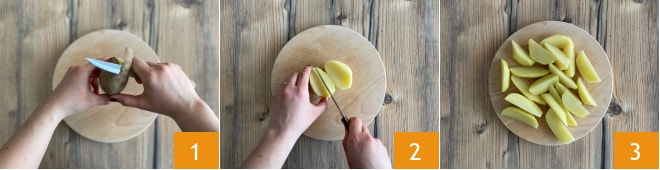 Para preparar salchicha y patatas en sartén empieza con los tubérculos, lávalos, sécalos y pélalos 1. Luego córtalos en gajos 2 a lo largo 3.