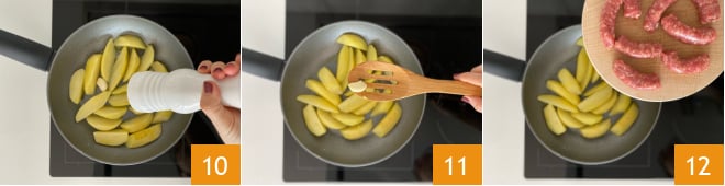 Sala al gusto 10, retira el ajo 11 y añade las salchichas 12.