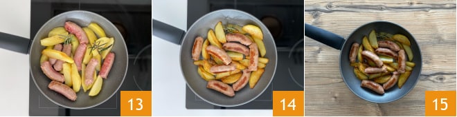 Perfuma con el romero ligeramente deshojado 13. En unos 20 minutos todo estará listo, así que cocina a temperatura media y remueve delicadamente de vez en cuando; ajusta la sal al gusto 14. Sirve el plato de salchicha y patatas en sartén bien caliente 15.