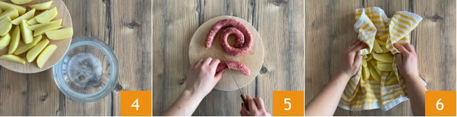 Vierte las patatas en gajos en un bol con agua en la que hayas disuelto el bicarbonato 4; déjalas en remojo durante 15 minutos. Mientras tanto, corta la salchicha en trozos de 6-7 cm cada uno 5 y reserva. Pasado el tiempo, escurre y seca bien las patatas 6.