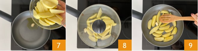 Dora el ajo en una sartén con un poco de aceite y luego añade las patatas 7, cubre con la tapa y cocina a fuego alto durante 5 minutos 8; gracias al vapor, se ablandarán, recuerda remover de vez en cuando 9.