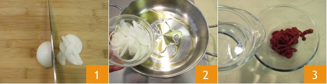 Para preparar las salchichas con salsa comenzad con las cebollas. Después de pelarlas, cortadlas finamente 1. Poned las tiras finas en una sartén con un chorrito de aceite y dejad que se doren a fuego lento durante unos minutos 2. Mientras tanto, echad el agua en el concentrado de tomate 3