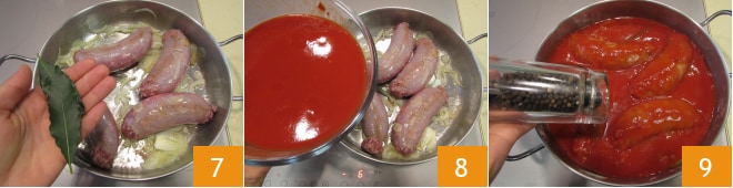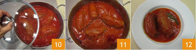 cubrid con la tapa y dejad cocinar a fuego lento durante unos 25 minutos 10. Al final, decidid la consistencia de la salsa según vuestro gusto, simplemente prolongad la cocción unos minutos, mejor si sin tapa, si queréis un condimento más espeso 11. Aquí tenéis listas vuestras salchichas con salsa, buen provecho 12