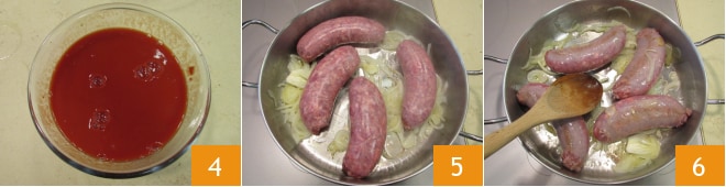 y mezclad bien para obtener el condimento 4. En este punto, volved a los fogones, la cebolla estará ablandada, echad las salchichas 5 y doradlas también durante unos minutos hasta que estén doradas por todos lados 6.