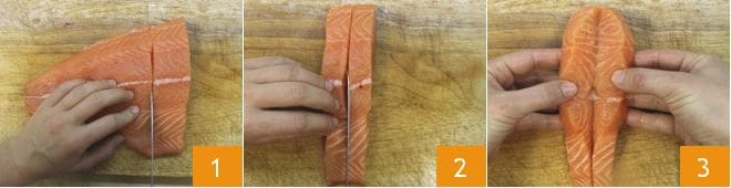 Para preparar el salmón crujiente sobre crema de judías blancas, comenzad desespinando el filete de salmón: equipaos con unas pinzas y eliminad las espinas que se encuentran a lo largo del lomo; una vez realizada esta operación, palpadead la carne para aseguraros de haberlas eliminado todas. Luego practicad el corte en forma de mariposa: cortad el filete en 4 rebanadas de unos tres dedos de ancho 1 e incisad a la mitad de cada rebanada, sin cortar completamente 2; finalmente, abrid las rebanadas de salmón como un libro 3, colocadlas en un plato y dejadlas a un lado. Este corte se puede realizar incluso si tenéis un filete de salmón con piel.