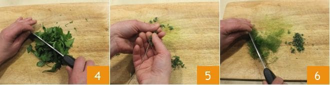 Ahora preparad las hierbas aromáticas que os servirán para cubrir vuestras mariposas de salmón: picad finamente un manojo de perejil 4, 2 ramitas de tomillo 5 y 2 ramitas de eneldo 6.