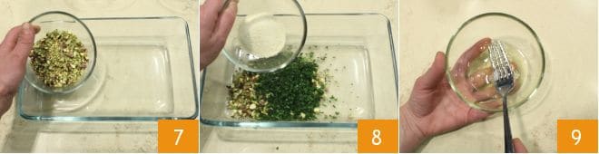 Verted unos pistachos pelados picados en una fuente 7 y unid también el picado de hierbas aromáticas y el pan rallado 8, finalmente, salpimentad al gusto, de este modo habéis preparado el empanado. Después, romped un huevo, eliminad la yema y batid ligeramente la clara 9.