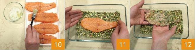 Pincelad toda la superficie de cada mariposa de salmón con la clara de huevo 10, luego colocadlas en la fuente con el empanado y dadle la vuelta por ambos lados hasta que queden completamente cubiertas (11-12). Poned las mariposas de salmón recubiertas en una bandeja y dejad a un lado.