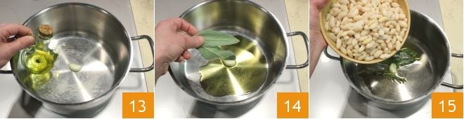 Dedicaos a la crema de judías blancas: tomad una cacerola grande y haced calentar un diente de ajo pelado y un chorro de aceite de oliva virgen extra 13, luego añadid la salvia 14 y el romero, dejad sofreír durante unos minutos (si queréis, podéis quitar el ajo después de haber sazonado el aceite), luego verted las judías blancas previamente remojadas y cocidas 15.