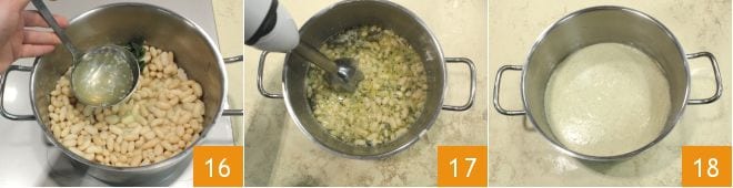 Rociad con un par de cucharones de caldo vegetal 16, sazonad con sal y pimienta y dejad cocinar durante unos minutos, hasta que las judías estén cremosas y secas. Para descubrir cómo prepararlo mejor, consultad nuestra Escuela de cocina: caldo vegetal. En este punto, quitad la cacerola del fuego y pasad la mezcla con una batidora de inmersión 17 directamente en la cacerola, hasta que obtengáis una crema suave y densa 18.