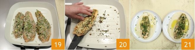 Ahora cocinad las mariposas de salmón: calentad bien una parrilla o una sartén grande, este es un paso importante porque bastarán realmente unos pocos minutos de cocción a fuego vivo para mantener la carne suave, alternativamente, podéis cocinar el salmón a fuego más bajo teniendo cuidado de no secar demasiado la carne. También podéis cocinar en la sartén con un poco de aceite. Cocinad por ambos lados a fuego moderado hasta que el exterior se dore (19-20) y el interior se mantenga jugoso. Solo queda emplatar: formad una cama de crema de judías blancas en el plato de servir y colocad encima la mariposa de salmón, terminad con un brote de eneldo, una pizca de tomillo y un chorrito de aceite crudo 21. ¡Servid vuestro salmón crujiente sobre crema de judías blancas y disfrutadlo bien caliente!
