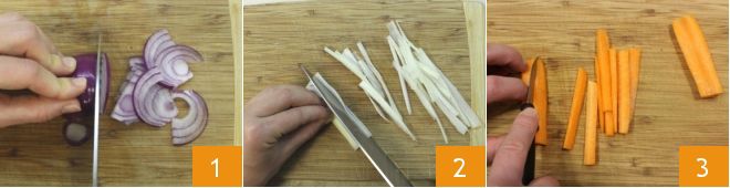 Para realizar el salmón en escabeche asegurate de haber comprado salmón noruego; de lo contrario, se recomienda congelarlo al menos 96 horas a -18 grados y luego descongelarlo para usarlo en la receta. Entonces toma la cebolla, pélala y divídela a la mitad, coloca la parte plana de una mitad sobre una tabla de cortar y córtala a lo largo 1. Lava bien el apio bajo el agua corriente y elimina las hojas externas, las laterales y las de la parte superior. Elimina la membrana filamentosa externa con un pelador de patatas. Divide el apio a la mitad y córtalo en tiras finas 2. Pela la zanahoria, luego córtala en tiras delgadas a lo largo 3.