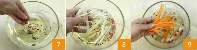 añade la pimienta rosa y la pimienta negra en grano 7 y vierte en la marinada las verduras cortadas en tiras: el apio 8, la zanahoria 9