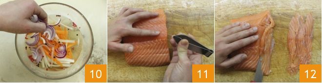 y la cebolla 10, mezcla con una cuchara de madera para que los ingredientes se impregnen de sabor. Ahora ocupaos del salmón: es fundamental que el salmón sea fresco y sobre todo asegurate con tu proveedor que ha sido "abatido", es decir, congelado a la temperatura correcta. Limpia el filete eliminando las espinas con unas pinzas de cocina 11 y luego corta el salmón en tiras delgadas 12.