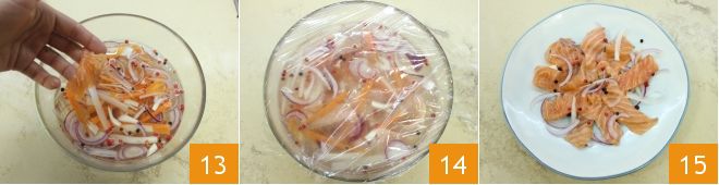 Vierte los bocados de salmón en el escabeche 13, cubre el recipiente con papel film transparente 14. Deja marinar el salmón en el frigorífico al menos 2 horas. Pasado el tiempo necesario, el pescado habrá absorbido los aromas de la marinada y podréis disfrutar de vuestro salmón en escabeche con juliana de verduras 15.