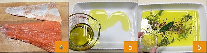 Una vez limpio, deberías obtener unos 800 g de filete de salmón 4. En este punto, puedes ocuparte de la marinada: vierte el aceite en una fuente de cerámica o vidrio de borde alto 5. Añade todos los aromas: el zumo de limón y la ralladura 6,