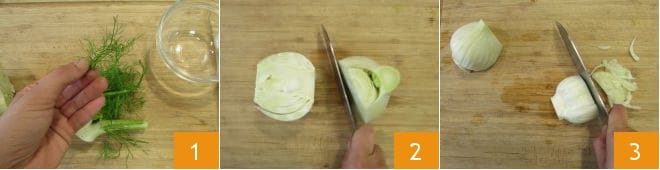Para preparar los salmonetes en papillote, comienza con el corte y la limpieza de todos los ingredientes. Empieza por el hinojo. Corta el penacho pero resérvalo 1. Luego divide el hinojo por la mitad 2, elimina la primera parte más externa y finalmente córtalo en rodajas finas 3.