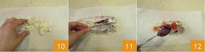 Ahora puedes pasar a formar los paquetitos. Sobre una hoja de papel de horno forma una cama de hinojo 10 y luego coloca encima 2 salmonetes limpios 11. Agrega los tomates y las aceitunas 12,