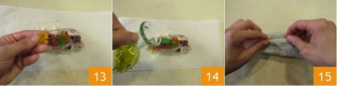 después un poco de penacho de hinojo y cáscara de naranja rallada 13. Perfuma con una hoja de albahaca, un poco de sal y pimienta y finalmente un chorrito de aceite 14 y para terminar cierra el paquetito como si fuera un caramelo 15.