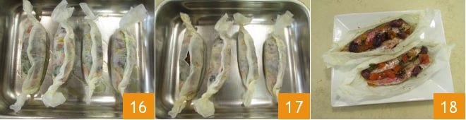 Coloca los cuatro paquetitos en una bandeja y rocía con un poco de aceite 16, cocina en horno precalentado a 180° durante unos 25 minutos 17. Tan pronto como estén listas, sirve inmediatamente tus fragantes salmonetes en papillote 18.