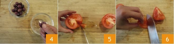 Enjuaga las aceitunas y elimina el hueso, a medida que las deshuesas colócalas en un cuenco pequeño 4. Luego limpia los tomates y divídelos en dos: elimina el pedúnculo practicando un corte en V 5 y quita la pulpa con las semillas 6.