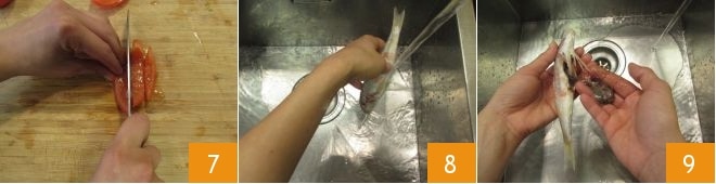 Finalmente, córtalos en tiras y luego en cuadritos de aproximadamente 1 cm 7. En este punto, tienes todo lo que necesitas, pasa a la limpieza de los salmonetes. Después de enjuagarlos bien bajo el agua 8, haz un corte con las tijeras a la altura del vientre y vacíalos. Luego vuelve a enjuagar por dentro y por fuera 9.