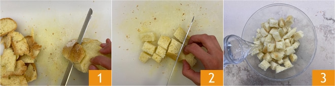 Para preparar el salmorejo, primero elimina la corteza del pan 1, luego córtalo en cubitos 2 y ponlo en un bol con agua 3, dejándolo en remojo durante 10 minutos.